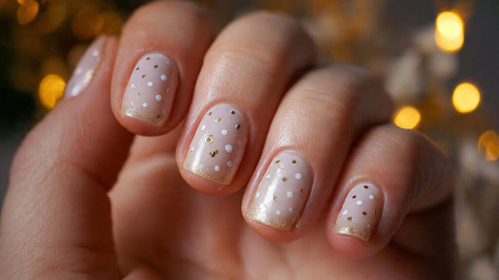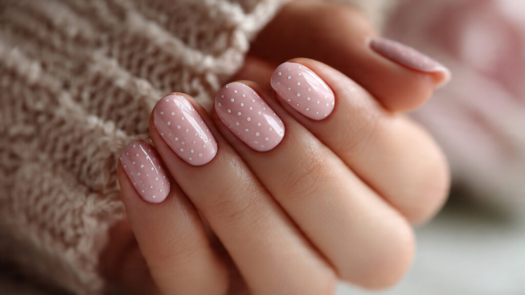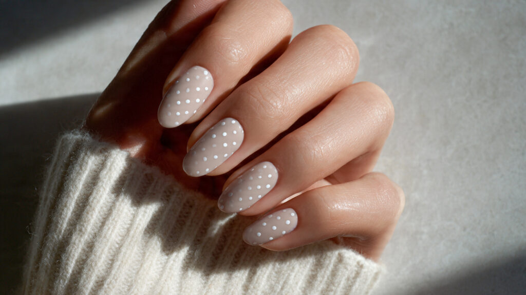 Keep dots evenly spaced and small for a clean effect. This manicure pairs well with neutral outfits and understated accessories.