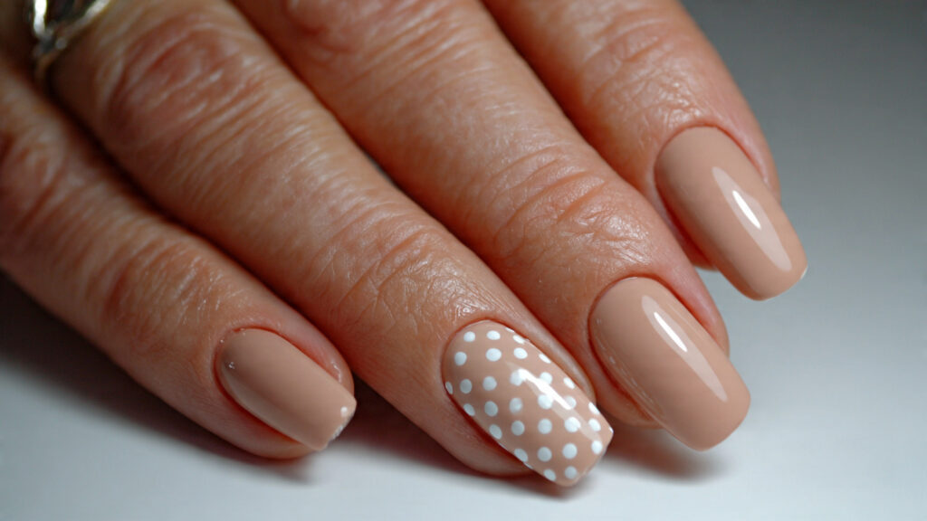 Beige polka dot nails feel calm and refined. The neutral base allows the dots to stand out subtly, creating a clean and elegant manicure.