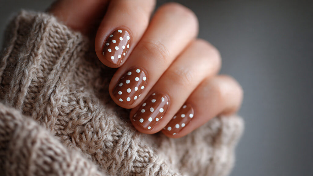 Brown tones add warmth and sophistication. A light or medium brown base with cream dots feels grounded and stylish. This design works beautifully for fall-inspired looks or everyday wear.
