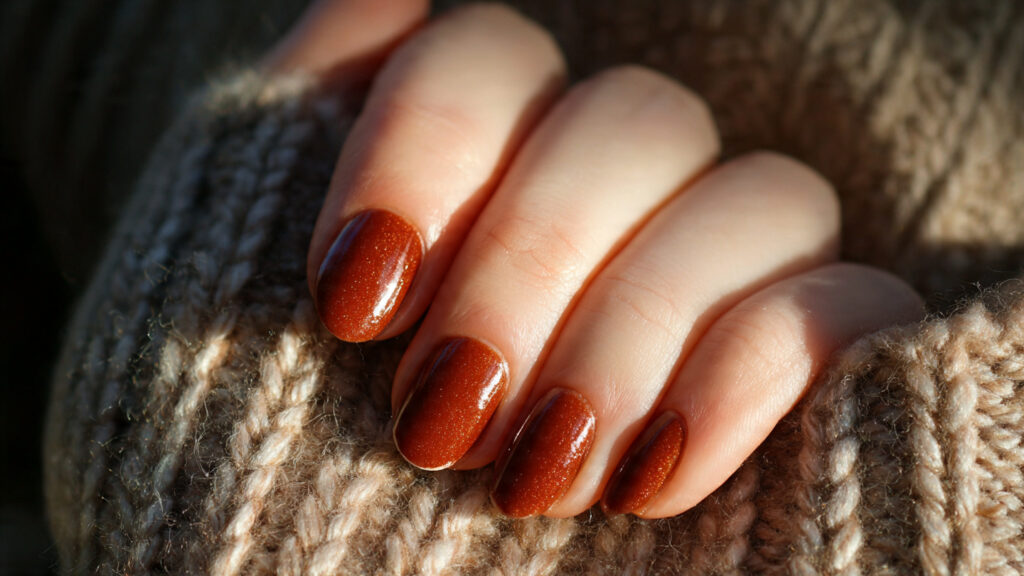 Add simple accent nails if desired, but the color alone is strong enough. Cinnamon spice nails are a favorite for fall.