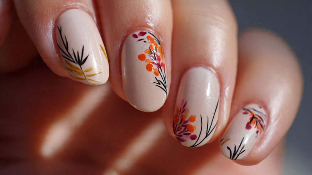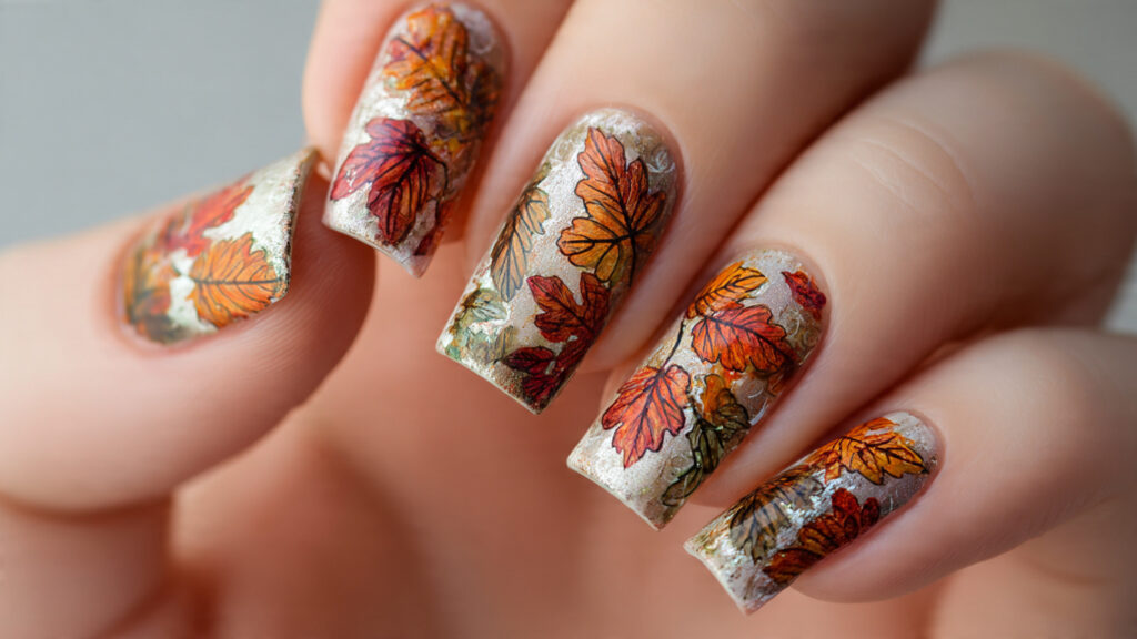 Leaf accents work especially well on one or two nails per hand. This keeps the design balanced and wearable for everyday activities. If you’re heading to a salon, ask for fine line details to keep the leaves delicate and polished.