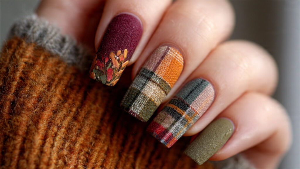 🍁 6. Plaid Thanksgiving Nail Art