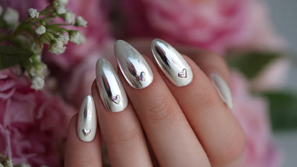A chrome ombre blends brightness and softness beautifully. The fade from natural pink into white chrome makes the shine feel lighter and more dimensional.