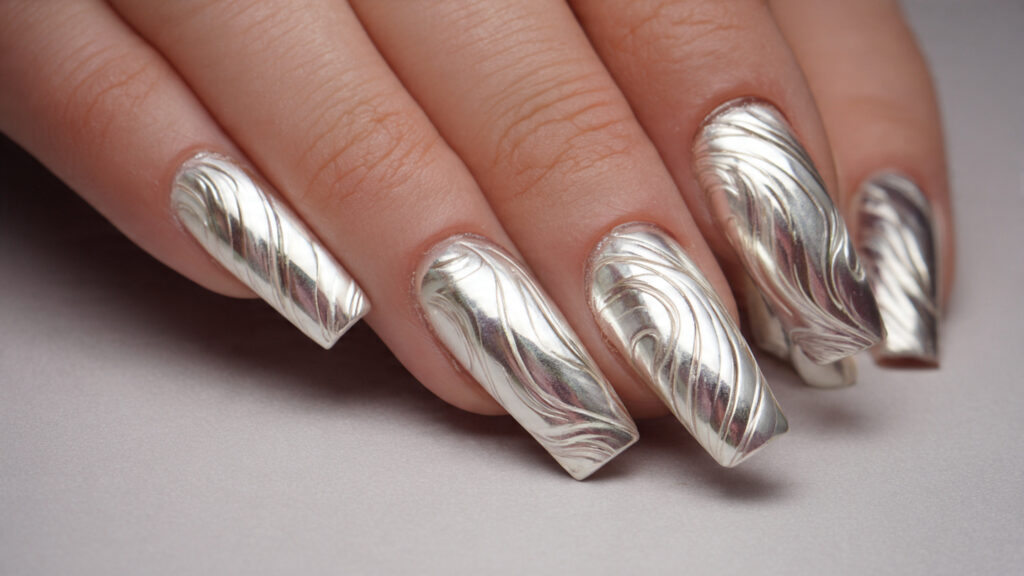 Alternate finishes or keep chrome on accent nails. This design feels creative yet sophisticated.