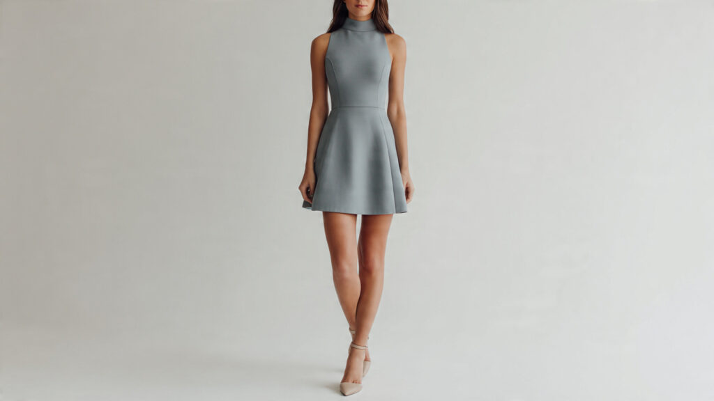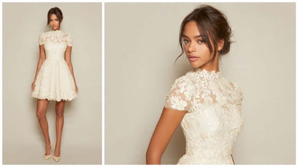 High-neck short dresses feel elegant and refined while still youthful. The higher neckline balances the shorter length beautifully.