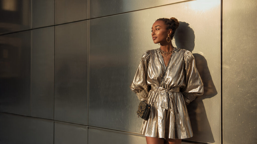 Keep styling minimal to let the fabric shine. Metallic dresses look stunning under evening lights.