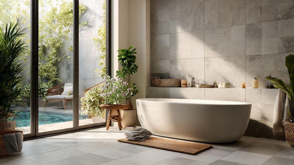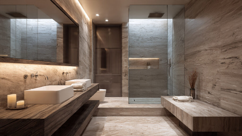 Material selection is a defining element of bathroom design in 2026. Natural and tactile surfaces dominate, reinforcing the connection to wellness and comfort. Stone, marble-inspired tiles, textured ceramics, and natural wood finishes are widely used to elevate the visual experience.