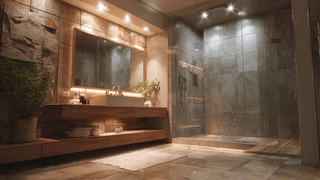 Accent lighting highlights textures, niches, or architectural details, adding depth and visual interest. Warm lighting temperatures are preferred, creating a spa-like ambiance that feels inviting rather than clinical. Integrated LED lighting is commonly used for its efficiency and sleek appearance.