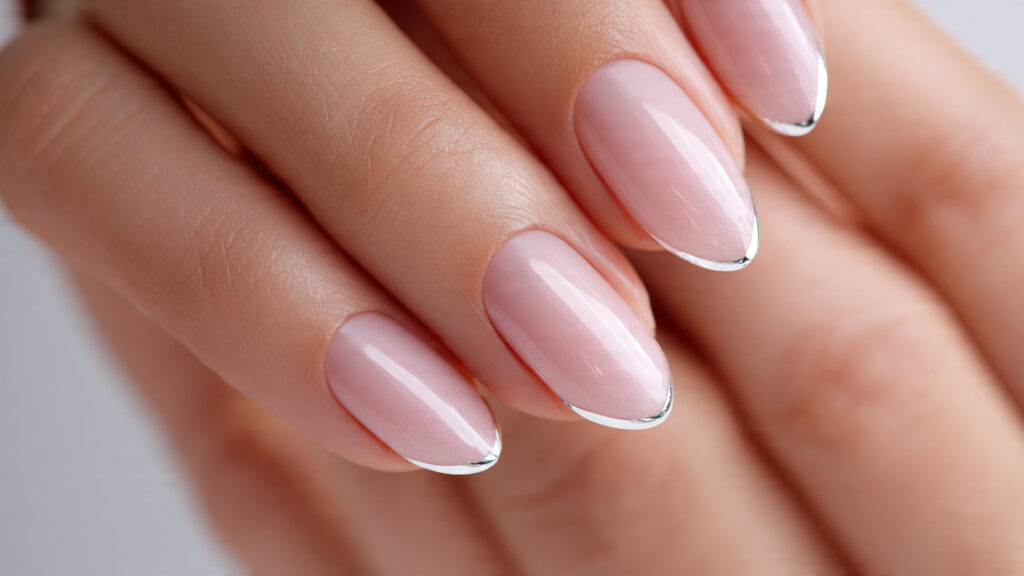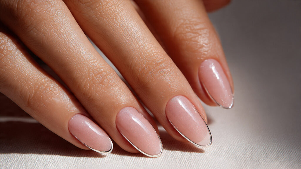 For the most flattering look, ask for ultra-thin tips and a high-gloss top coat. Almond or oval shapes enhance the elegance of the metallic line. This style pairs beautifully with silver jewelry and soft neutral outfits. It’s a timeless choice that feels modern yet understated.