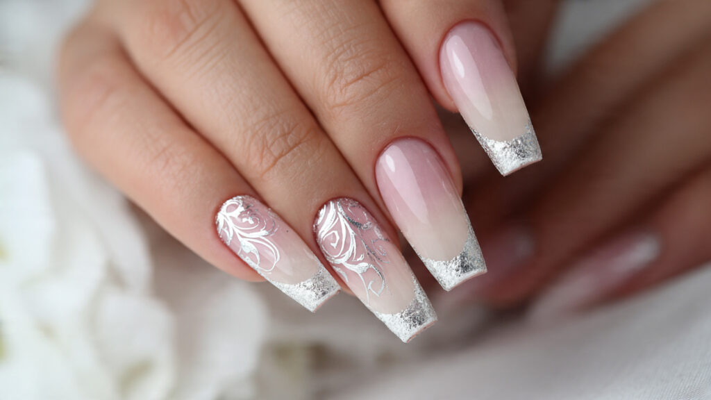 A glossy pale pink base paired with slim silver tips creates a clean and refined manicure. This design keeps the traditional French shape but replaces white with cool metallic shine. The silver edge adds brightness without overpowering the nail, making it suitable for everyday wear and formal occasions alike.