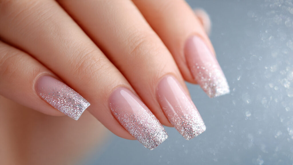 Choose fine glitter for a smooth finish rather than chunky sparkle. A soft blush or milky base keeps the design delicate and wearable. Coffin or ballerina shapes allow the gradient to stand out beautifully. Seal everything with a glossy top coat to enhance shine and durability.