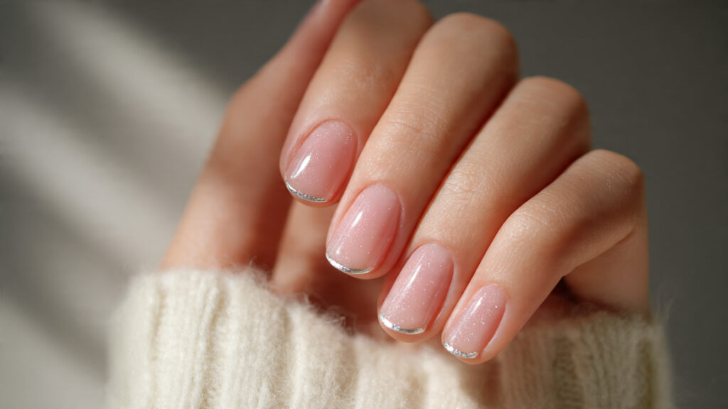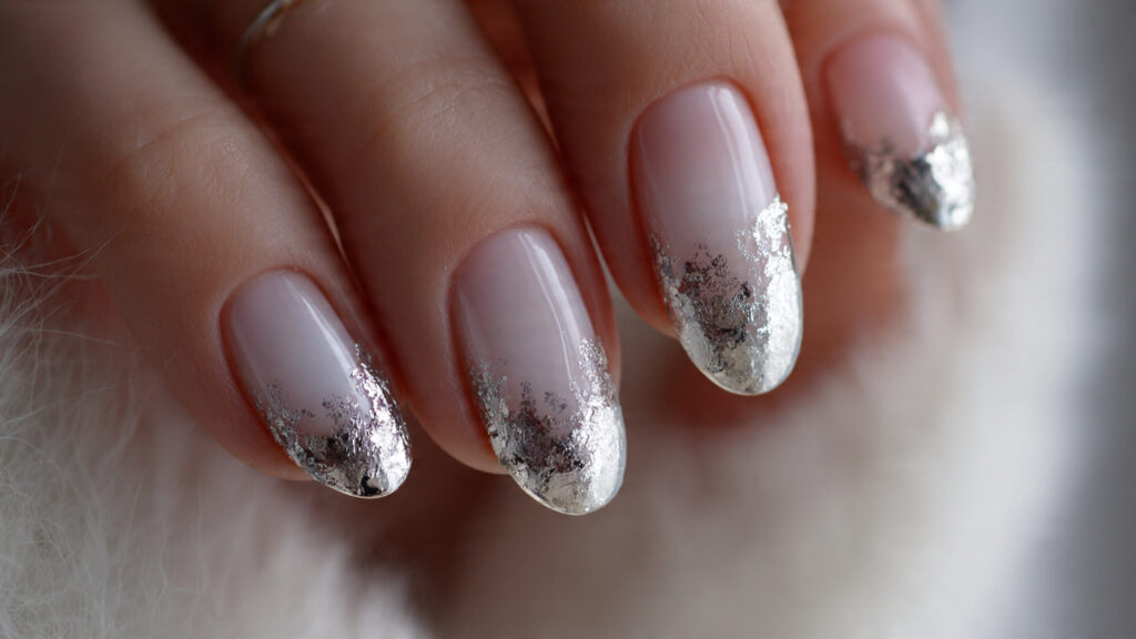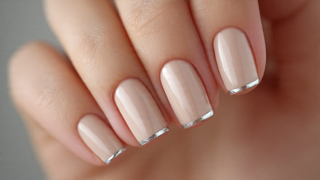 The reverse French places silver at the base instead of the tip. A metallic half-moon near the cuticle adds subtle shine while keeping the rest of the nail simple. This twist feels modern and fresh.
