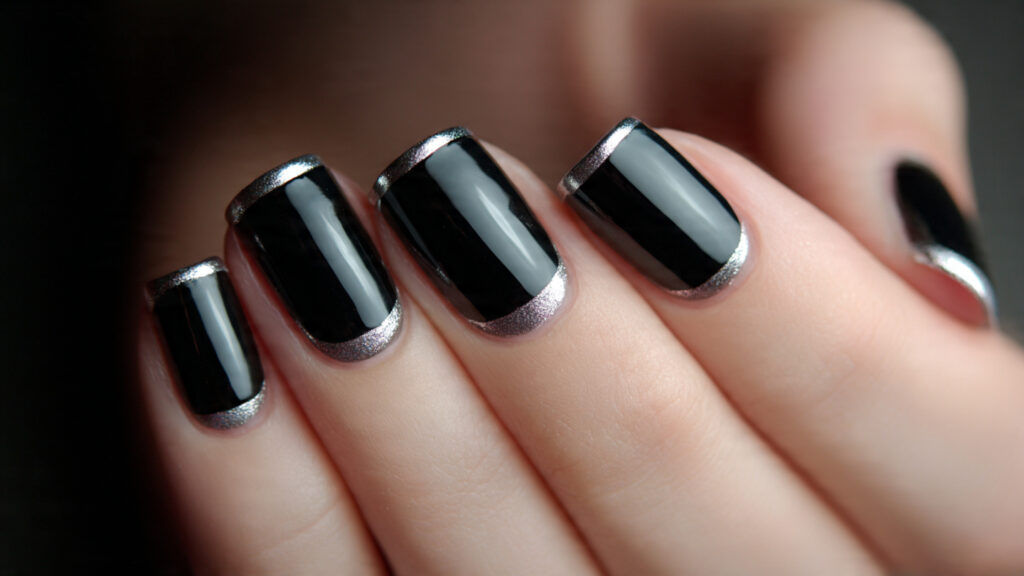 Black and silver together create striking contrast. A black tip outlined with silver adds depth and sharpness. The metallic border softens the darkness while keeping the manicure bold.