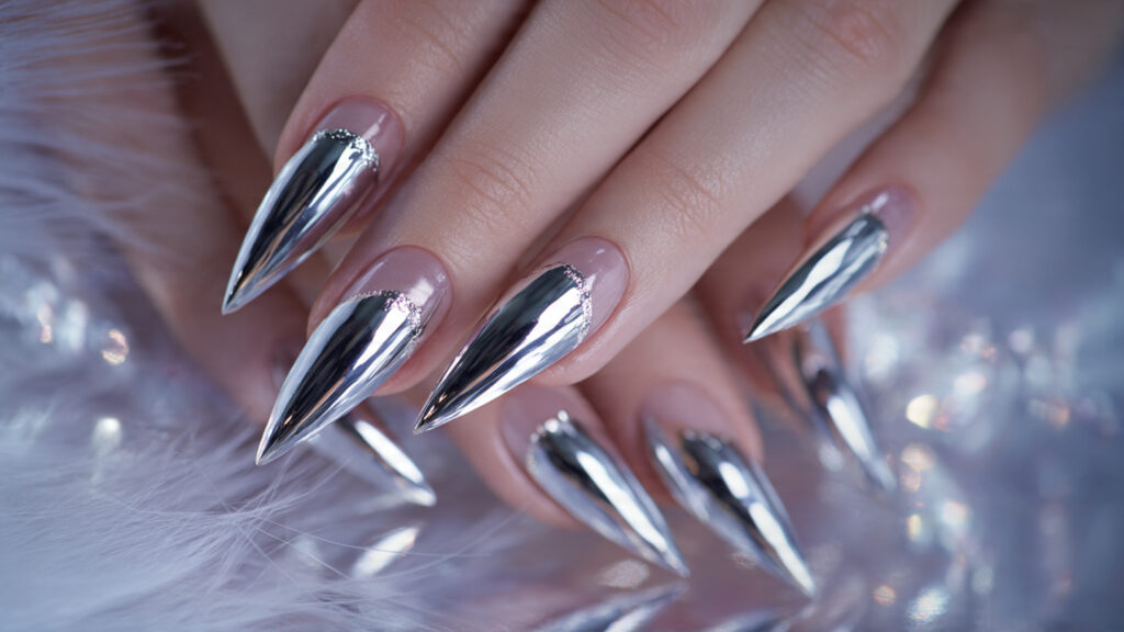Longer shapes like stiletto or coffin enhance the chrome effect. Keep the base clear or soft pink for balance. This style is perfect for evening events, parties, or whenever you want your manicure to stand out with a futuristic glow.