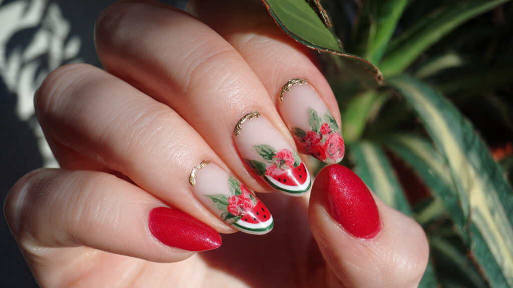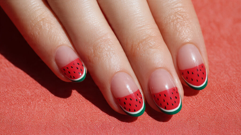 The half-moon watermelon design places the fruit detail near the cuticle instead of the tip. This unexpected placement adds creativity while keeping the overall manicure neat and wearable.