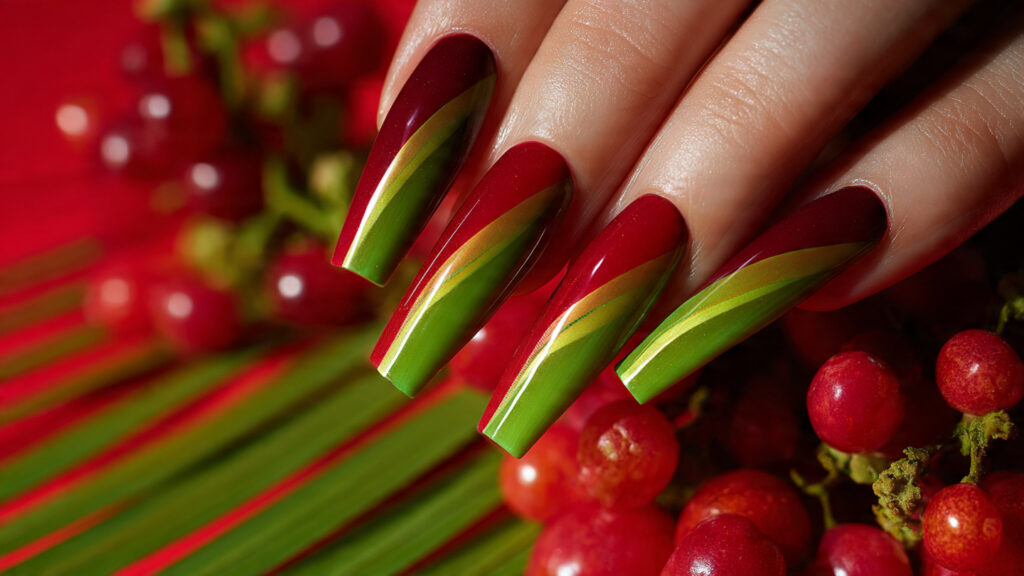 Paint the base red, then create a curved white stripe followed by green along the cuticle line. Add small seed details to complete the look. This style grows out gracefully and works well for both short and medium-length nails.