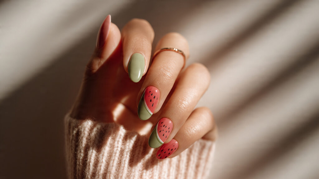 Pastel watermelon nails tone down the traditional bright shades into softer versions. Light red and muted green create a subtle seasonal look that feels fresh and modern. This option is great for everyday wear.