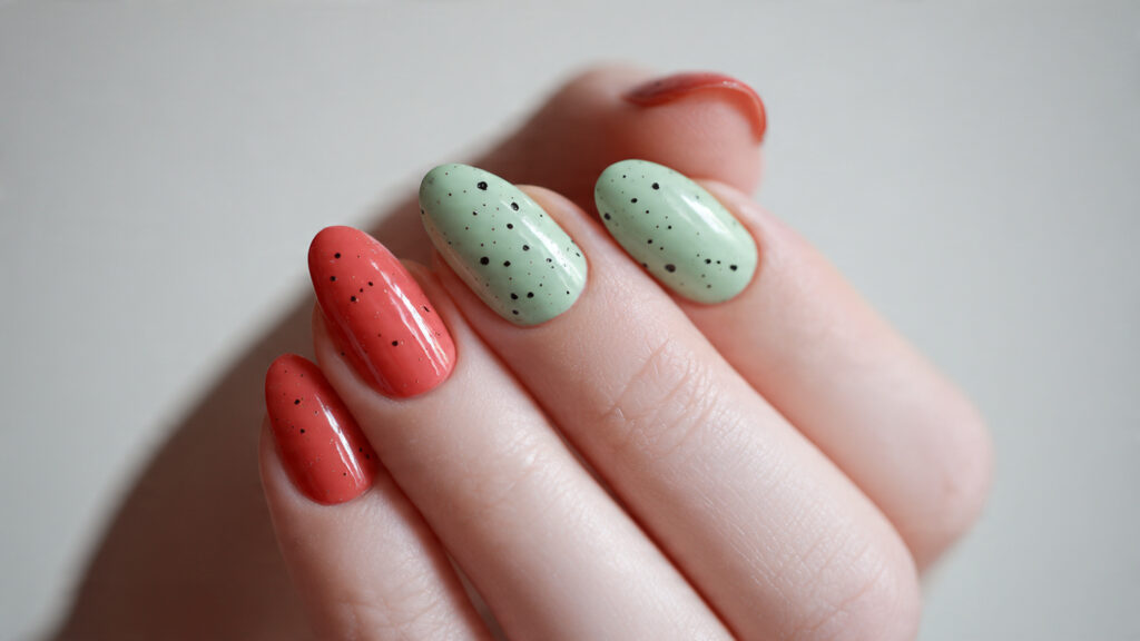 Mixing watermelon slices with green polka dots adds variety to your manicure. Alternate between detailed slice designs and simple dotted nails to create balance. The playful contrast keeps the look lively and dynamic.