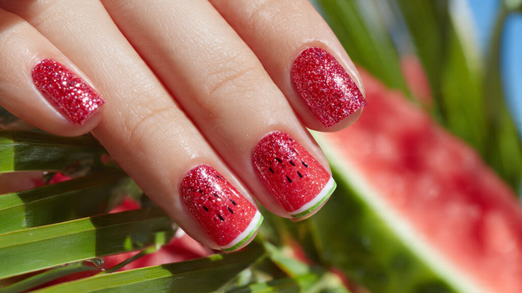 Apply glitter polish lightly over the red base before adding seeds. Keep the green rind solid for contrast. Seal with a glossy top coat to lock in sparkle and prevent rough texture. The subtle shimmer catches sunlight beautifully, making your manicure stand out in photos.