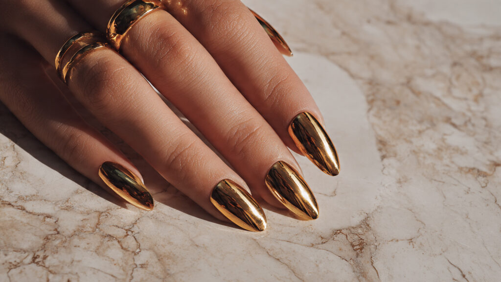 Gold chrome nails radiate confidence and luxury. The bold metallic shine instantly elevates any outfit, whether casual or formal. On longer nails, the effect looks dramatic and high-end, making it perfect for celebrations or special occasions.