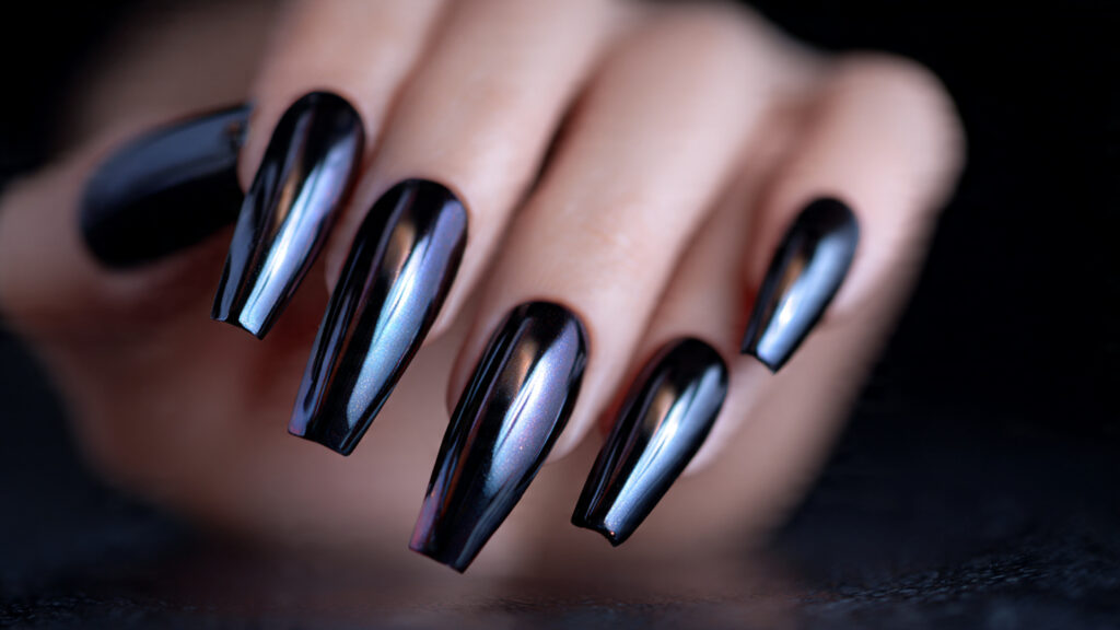 Black chrome nails offer a bold, edgy twist on classic metallics. The reflective black finish looks powerful and sleek, especially on longer nail shapes. It combines mystery and glamour in one striking manicure.