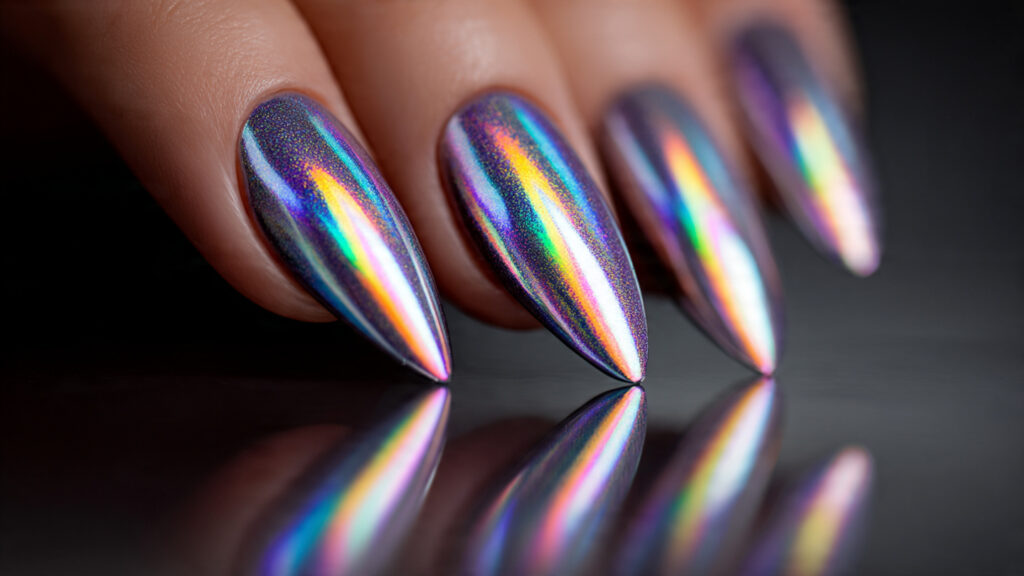 Holographic chrome nails shift colors depending on the light, creating a mesmerizing rainbow effect. This style feels bold, playful, and perfect for anyone who loves experimenting with statement manicures. Under sunlight or flash photography, the multidimensional shine truly comes alive.