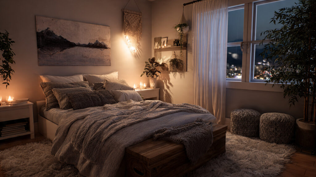 Accessories add personality and warmth to a bedroom. Artwork, framed photographs, candles, plants, and decorative mirrors contribute to a cozy feel when used in moderation. Each accessory should complement the overall design without creating visual clutter.