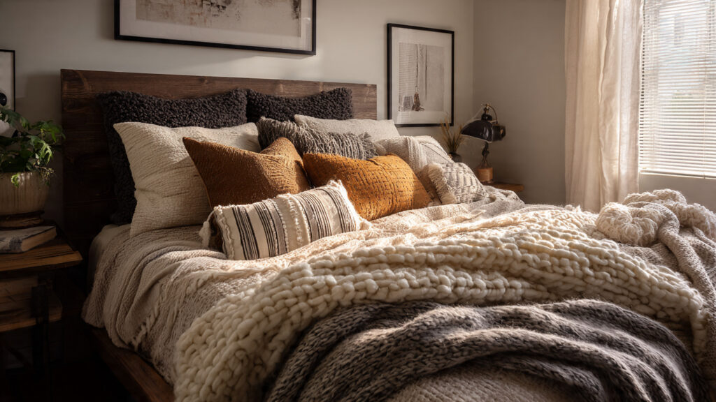 Layered textiles are a defining feature of cozy bedroom design. Soft bedding, plush throws, and decorative cushions add warmth and texture. Materials like cotton, linen, wool, and velvet enhance comfort while creating visual depth. Rugs placed under the bed or seating area further soften the space and make the bedroom feel warm and welcoming.