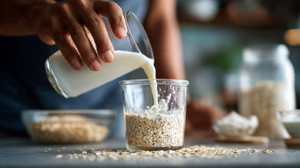 Overnight oats are a simple breakfast preparation method where rolled oats are soaked in milk, yogurt, and natural sweeteners overnight inside a refrigerator. During this time, oats absorb the liquid and become soft, creamy, and ready to eat in the morning.