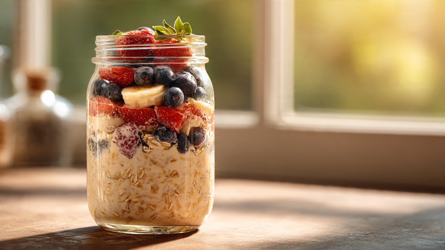 Overnight oats are a simple breakfast preparation method where rolled oats are soaked in milk, yogurt, and natural sweeteners overnight inside a refrigerator. During this time, oats absorb the liquid and become soft, creamy, and ready to eat in the morning.