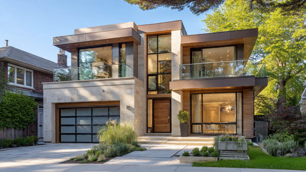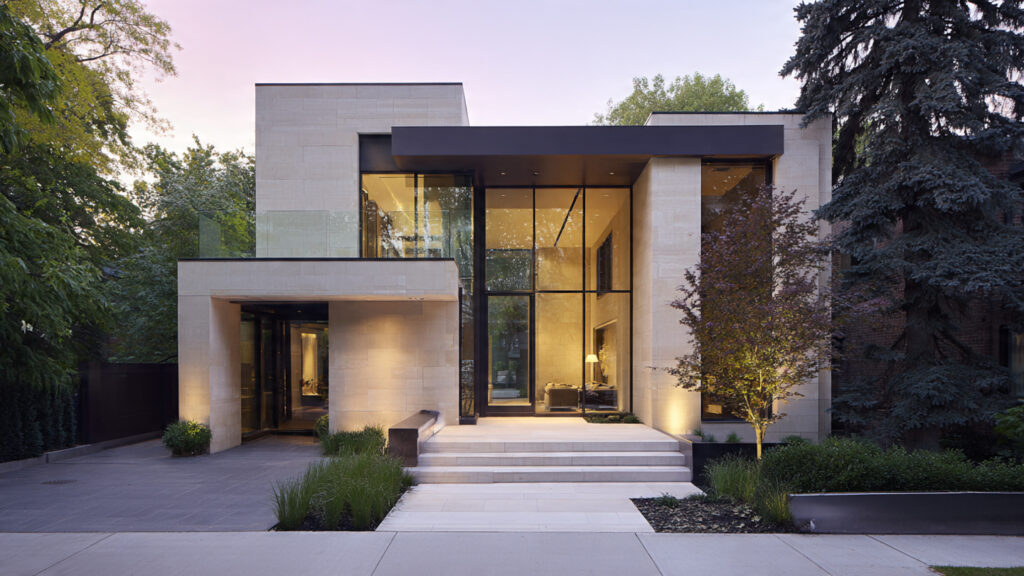 Modern luxury facades focus on simplicity, symmetry, and bold architectural forms. Flat roofs, large windows, clean edges, and contrasting materials like concrete, glass, and wood define contemporary front home styling. Neutral color palettes paired with textured surfaces create depth while maintaining a refined appearance. Minimal ornamentation ensures the design feels upscale and uncluttered.