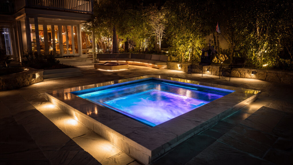 Lighting defines the mood of an outdoor jacuzzi space. Ambient lighting creates warmth, while task and accent lighting improve visibility and safety. LED strip lighting, deck lights, and underwater jacuzzi lights add depth and elegance. Warm lighting tones are especially effective for evening use, enhancing relaxation and comfort.