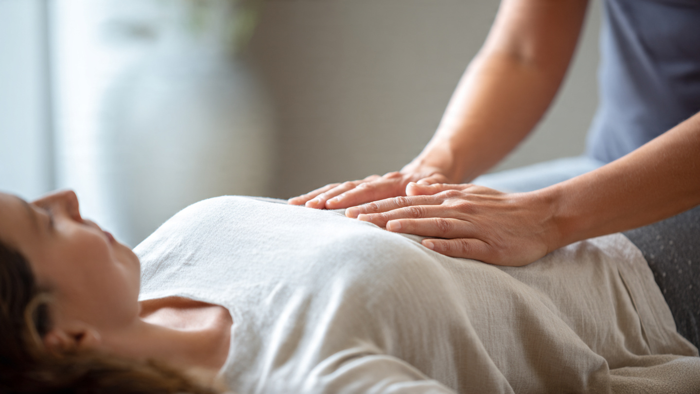 Start by lying comfortably on your back. Using flat fingers, make slow clockwise circular motions around your abdomen. Keep pressure light; imagine gently moving the skin rather than pressing deeply into muscles.