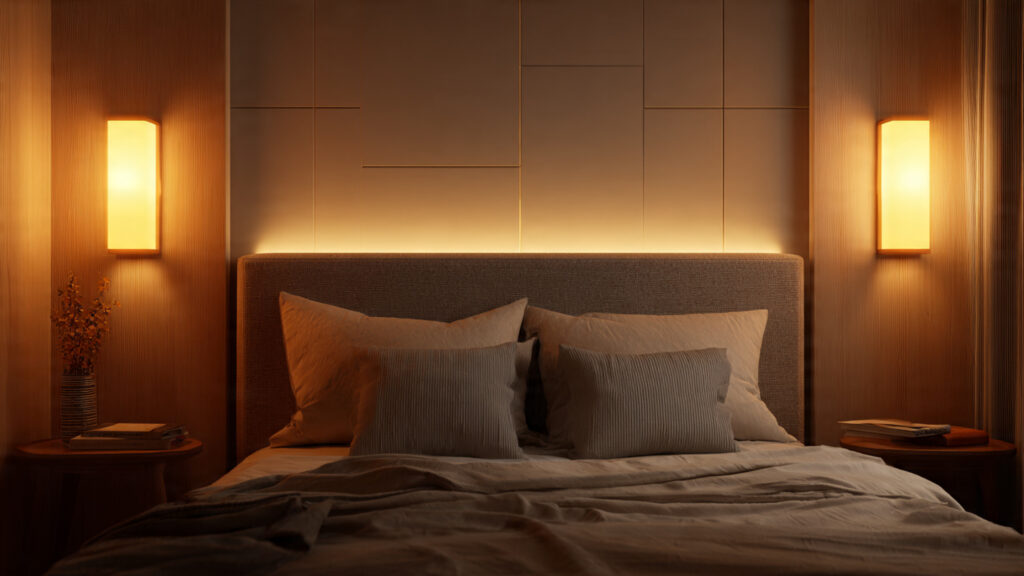 Lighting design in small bedrooms focuses on warmth and layering. Soft ambient lighting, bedside wall lamps, and concealed LED strips create a cozy atmosphere without overwhelming the space. Proper lighting placement enhances comfort and makes the bedroom feel more inviting.