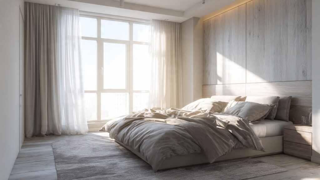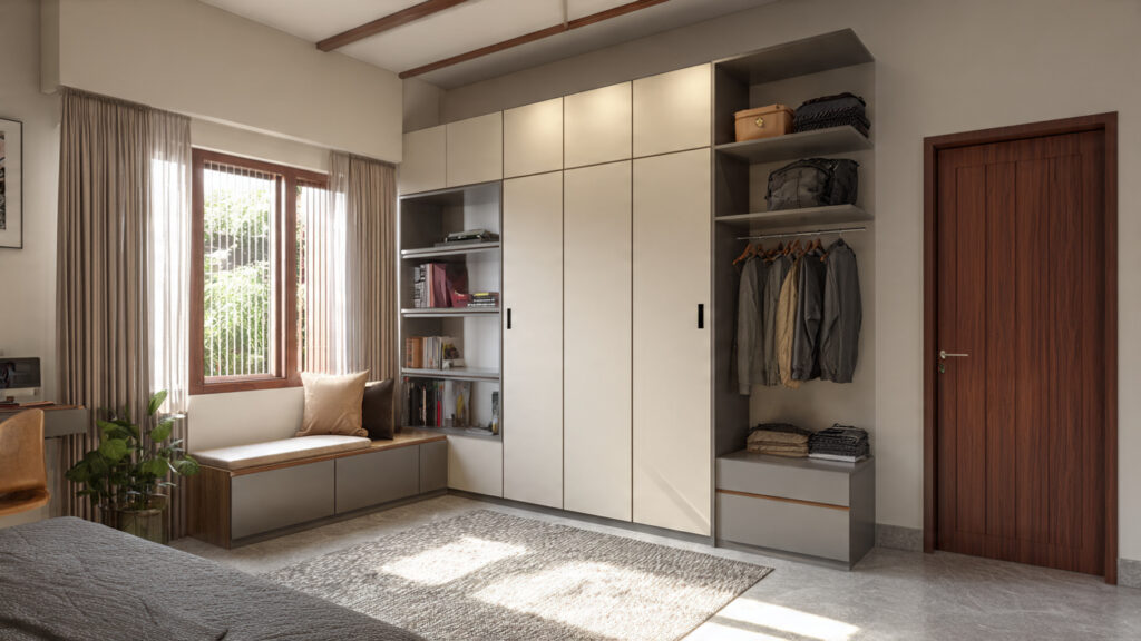 Vertical design elements such as tall wardrobes, vertical wall panels, and elongated headboards draw the eye upward, making the room appear taller. This technique helps balance proportions and gives compact bedrooms a more refined architectural presence.