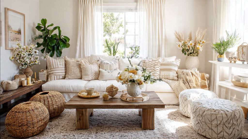 The living room is one of the most impactful spaces to update for spring. Swapping dark textiles for lighter ones, adding fresh cushions, and incorporating natural materials instantly changes the mood. Floral accents, woven baskets, and light-toned décor pieces bring warmth and charm. Spring decorating ideas for the home encourage balance, ensuring the living room feels relaxed, fresh, and welcoming.